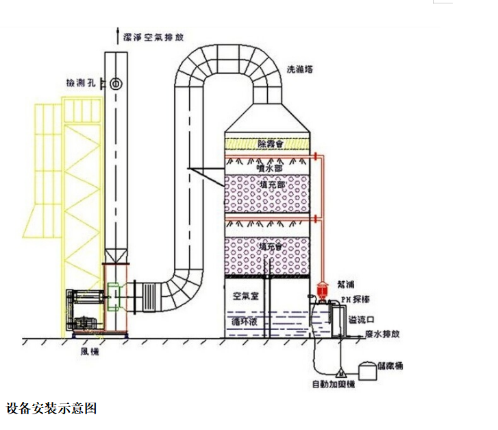 應根據使用情況定期檢查塔體底部儲液池內液體酸堿度、飽和度及排氣口氣體凈化程度,超過排放標準參數時,應更換底部儲液池中或者沉淀池中的藥水吸收液。