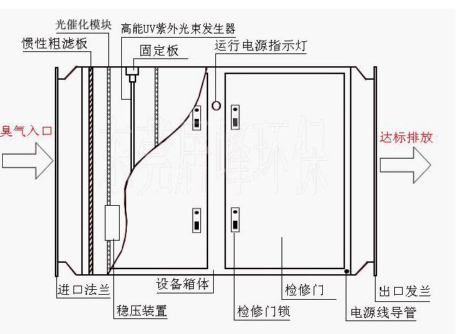 當廢氣進入等離子光解一體機凈化設備內時,先經過等離子體化學反應過程,即電子首先從電場獲得能量,通過激發或電離將能量轉移到分子或原子中去,獲得能量的分子或原子被激發,同時有部分分子被電離, 從而成為活性基團;之后這些活性基團與分子或原子、活性基團與活性基團之間相互碰撞后生成穩定產物和熱。(在外加電場的作用下,介質放電產生的大量攜能電子轟擊污染物分子,使其電離、解離和激發,然后便引發了一系列復雜的物理、化學反應,使復雜大分子污染物轉變為簡單小分子安全物質,或使有毒有害物質轉變成無毒無害或低毒低害的物質,從而使污染物得以降解去除。)
