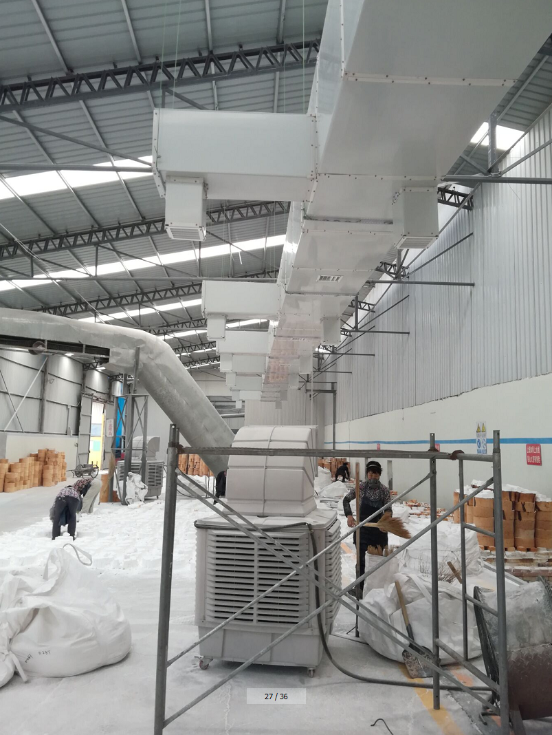 湖北某輪胎生產廠通過網絡平臺找到我們公司,在該公司看過我們給出的專業車間降溫解決方案,又考察了我們公司做過環保空調降溫的輪胎廠,終對整體方案、綜合能力非常認可,選擇與我公司合作。我公司業務人員、技術人員現場勘察后,特采用車間降溫濕簾冷風機機組30臺,設計機組在車間頂部平均分布安裝,底部連接通風管道短接向下送風,機組運轉將新鮮的冷空氣輸送到車間內部。經測試車間內溫度降低10度左右,效果明顯。